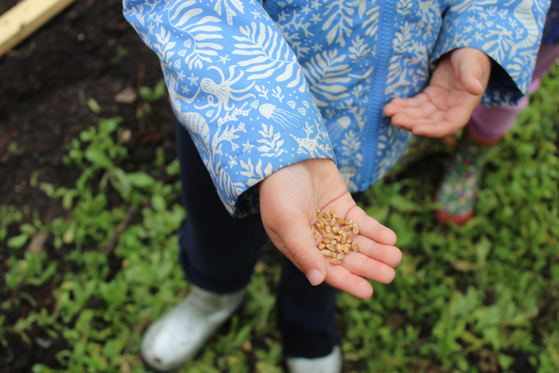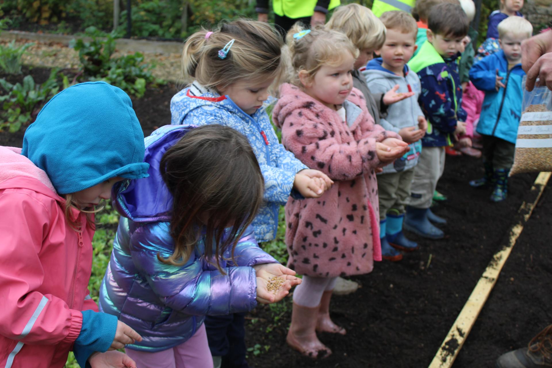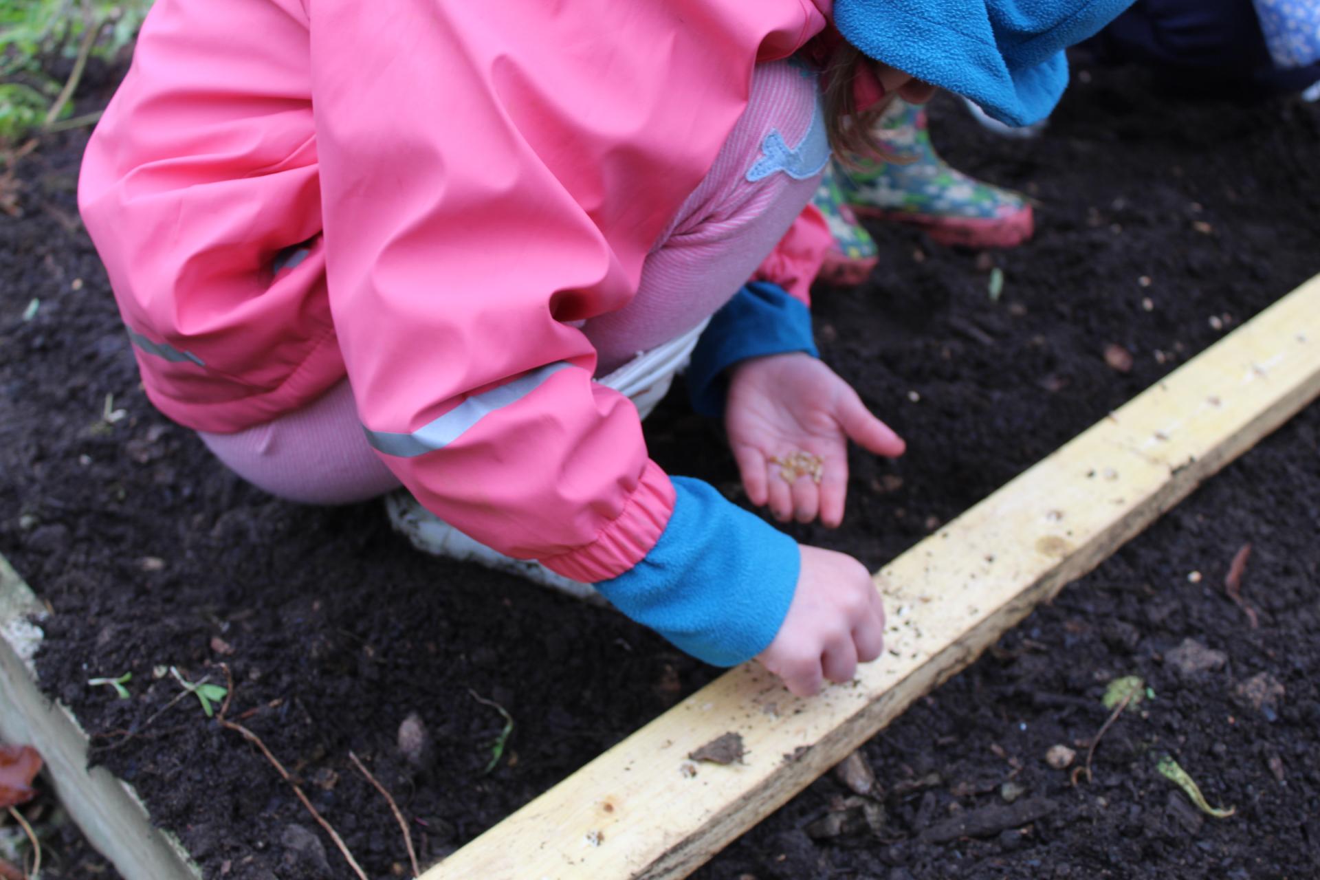 The children carefully placed the seeds into the holes and pushed them gently, so they fell through into the soil.