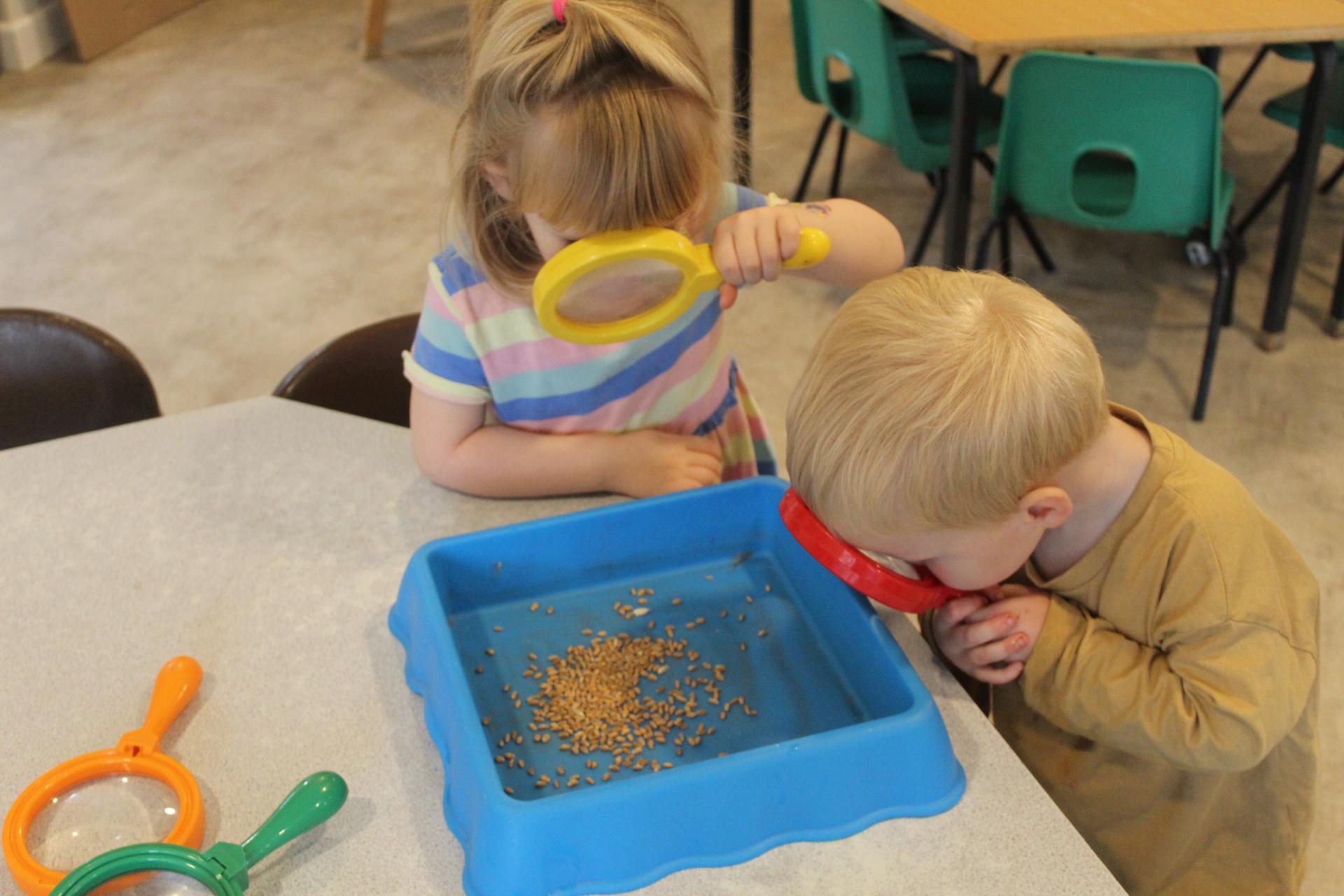 When we returned to nursery, the children put some wheat seeds into a tray and looked at them through the magnifying glasses. “I can see the seeds” “they look big".