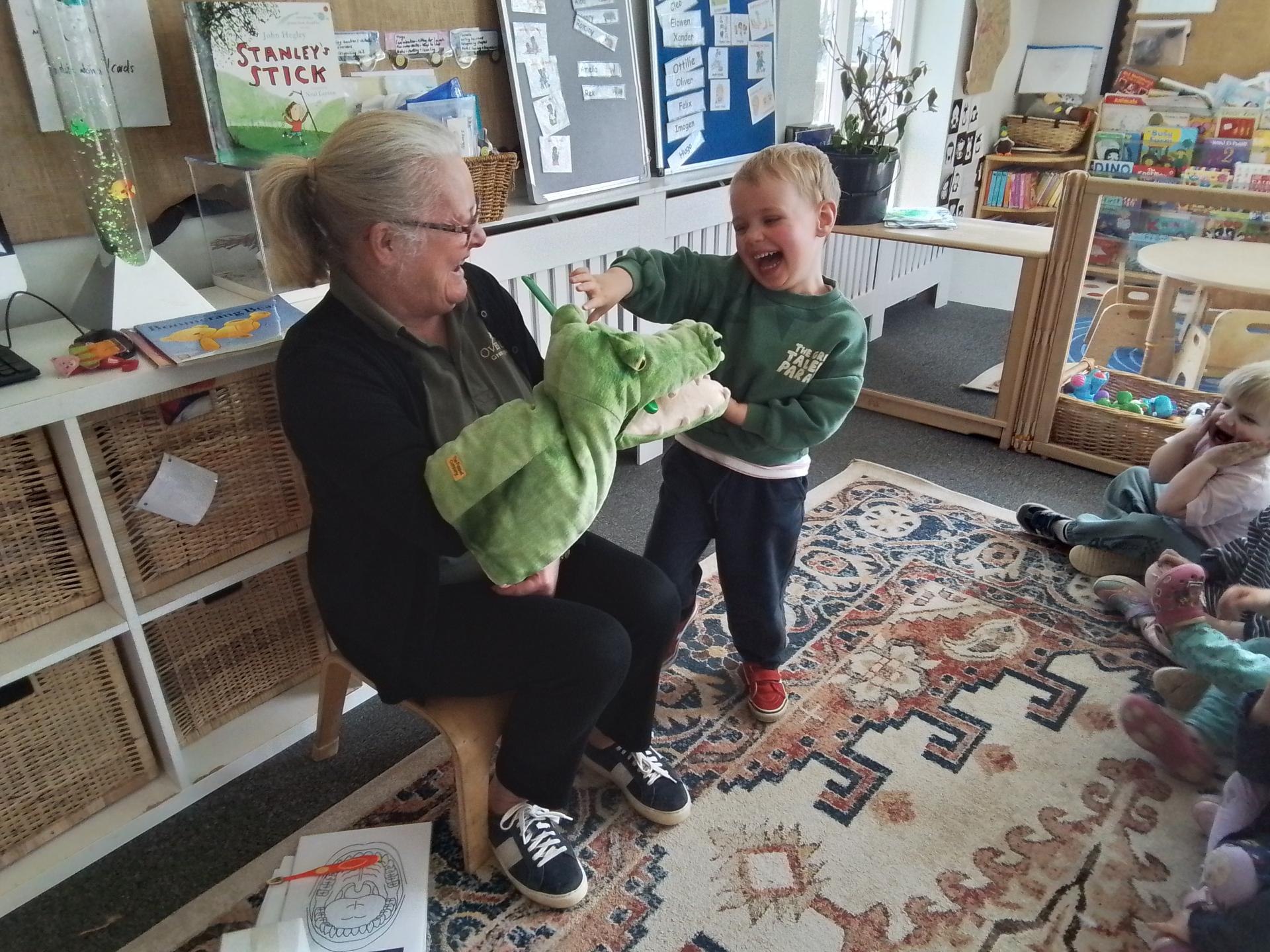 At Grasshoppers, we like to use the story Smile Crocodile, Smile, which is about a crocodile who spends her whole day cleaning her many teeth and misses out on a day of fun. Her friends notice this and gift her a giant toothbrush so she can clean her teeth quickly and join in with the fun the following day. The children really enjoyed listening to the story and talking about why it is important to brush our teeth properly.