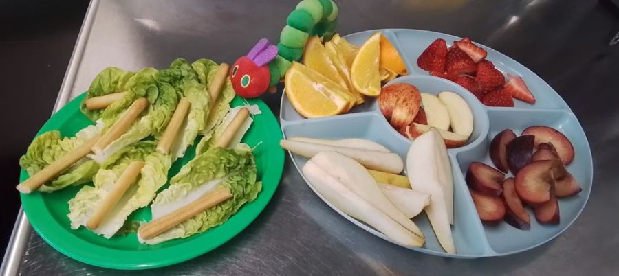 Alongside learning about keeping our teeth clean and healthy, we also discussed healthy eating with the help of the story The Very Hungry Caterpillar. The children enjoyed listening to the story and naming the different fruits the caterpillar ate. For snack time, we followed the story by tasting a variety of fruits, including one strawberry, one piece of plum, one slice of pear, one segment of orange, one bite of apple, and a tiny caterpillar on a leaf made from a lettuce leaf and breadstick. The children were excited to try different fruits and talk about which ones they liked the most.